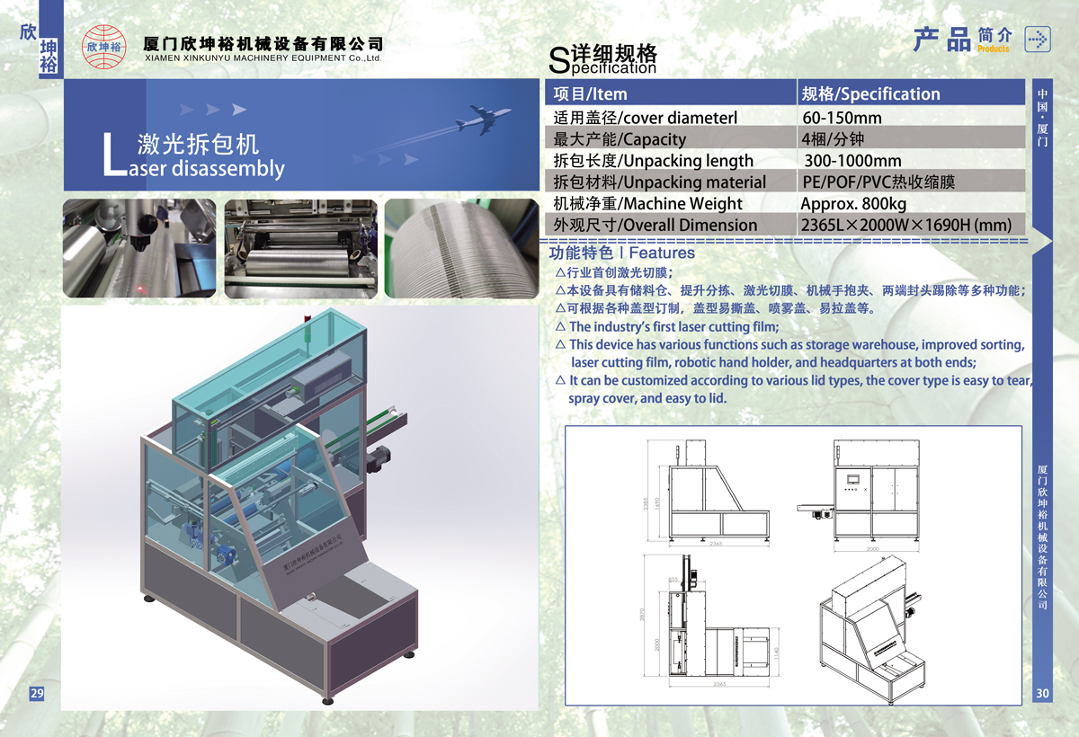 △本設備具有儲料倉、提升分揀、激光切膜、機械手抱夾、兩端封頭踢除等多種功能;